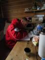 Dann reicht es uns aber wirklich und wir gehen zurück zur Hütte, wo es erstmal unsere obligatorische Nudelsuppe und Tee gibt. Jan und Andreas müssen die Suppe wohl gerochen haben, denn gerade als das Wasser zu kochen beginnt, strecken sie ihre Köpfe durch die Tür. Eine Sardinen- und Makrelendose vervollständigen unser Mittagessen. Es ist jetzt 15:30 Uhr! Zeit ans Abendessen zu denken. Wir wollten zuvor noch den zweiten Versuchsaufbau inspizieren, aber es ist so schlechtes Wetter, dass wir damit bis Morgen warten werden. Es ist jetzt die Kunst, die ganzen Klamotten bis morgen wieder trocken zu bekommen ohne gleichzeitig die trockenen Sachen nass werden zu lassen. Matteo und ich kriegen noch einen Espresso, dann zeigen sich die Spuren unseres Tages – Jan und Matteo fallen auf ihren Betten in den Schlaf und bald ist von ihnen nur noch leises Schnaufen zu hören. Ernst arbeitet an seinem Feldbuch und Andreas bereitet das Abendessen vor. Ich beschäftige mich damit den Blog zu schreiben, Bilder herunterladen und auf das Essen zu warten Um 19:00 Uhr rufe ich mit dem Satellitentelefon in Ny Alesund an. Wir hatten diesen täglichen Anruf vereinbart damit Gregory immer weiß, ob es uns gut geht. Eine reine Sicherheitsmaßnahme also, und kein Vorwand für einen munteren Plausch. Leider gibt es noch keine aktuelle Wettervorhersage und so verbleiben wir, dass wir um 20:00 Uhr nochmal anrufen werden. Das Wetter scheint langsam aber sicher etwas besser zu werden, was natürlich wichtig wäre, um morgen ordentlich graben zu können. Im Regen ist es fast unmöglich und würde in einer „totalen Schlammschlacht“ enden.