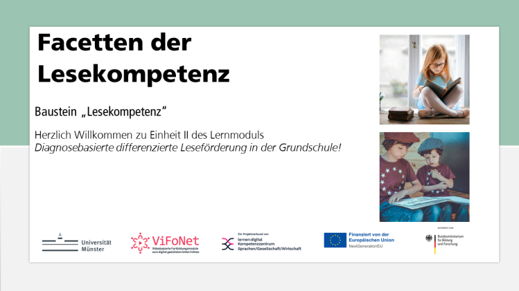 In der Einheit „Facetten der Lesekompetenz“ erhalten Lernende tiefergehende Informationen zu den zentralen Leseteilkompetenzen Lesegenauigkeit, Lesegeschwindigkeit und Leseverständnis und ihren Zusammenhang. Weiter wird auf die Beziehung zwischen Lesekompetenz und Lesemotivation eingegangen.