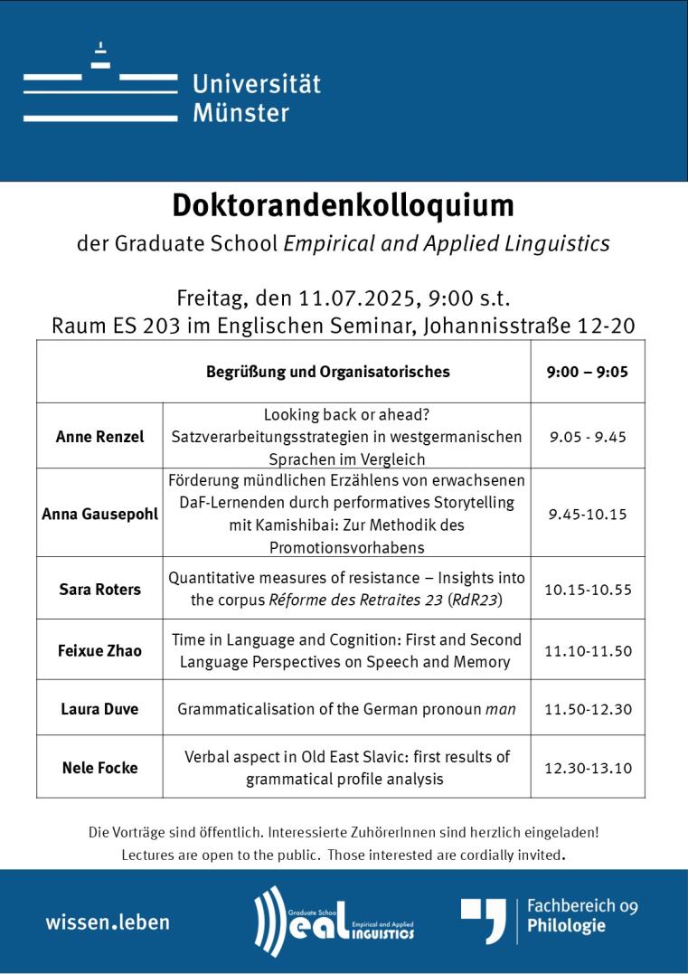 The doctoral program Empirical and Applied Linguistics organizes events on a regular basis. In addition to the guest lectures in the Research Forum, which are open to the public, we offer workshops for our doctoral students at least once a year, which serve to teach relevant working tools or to deepen methodological knowledge. Twice a year, the doctoral colloquium is held, in which doctoral students present and discuss their dissertation projects.