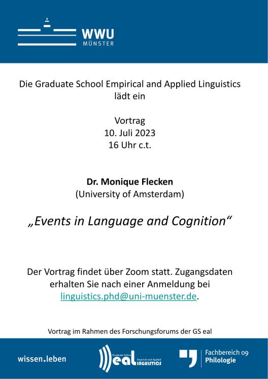 Am 10.07.2023 hört die GS eal einen Gastvortrag von Dr. Monique Flecken zum Thema "Events in Language and Cognition". Der Vortrag findet über Zoom statt. Zugangsdaten erhalten Sie nach Anmeldung unter: linguistics.phd@uni-muenster.de