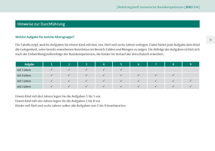 Die Aufgaben führen Sie mit dem Kind im Einzelgespräch durch. Dabei werden die Kinder durch das ansprechende Material und Ihre zugewandte, freundliche Art motiviert, ihre bereits erworbenen mathematischen Kompetenzen zu zeigen. Halten Sie sich strikt an die Vorgaben des Anleitungshefts! Nur dann bekommen Sie zuverlässige Ergebnisse.