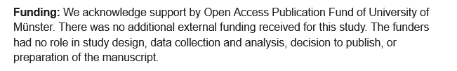 - Wenn Sie vor Einreichung eines Open-Access-Artikels bereits wissen, dass eine Erstattung der Kosten über den Publikationsfonds der Universität Münster möglich ist, geben Sie bitte auch den entsprechenden Vermerk an: "We acknowledge support from the Open Access Publication Fund of the University of Münster."