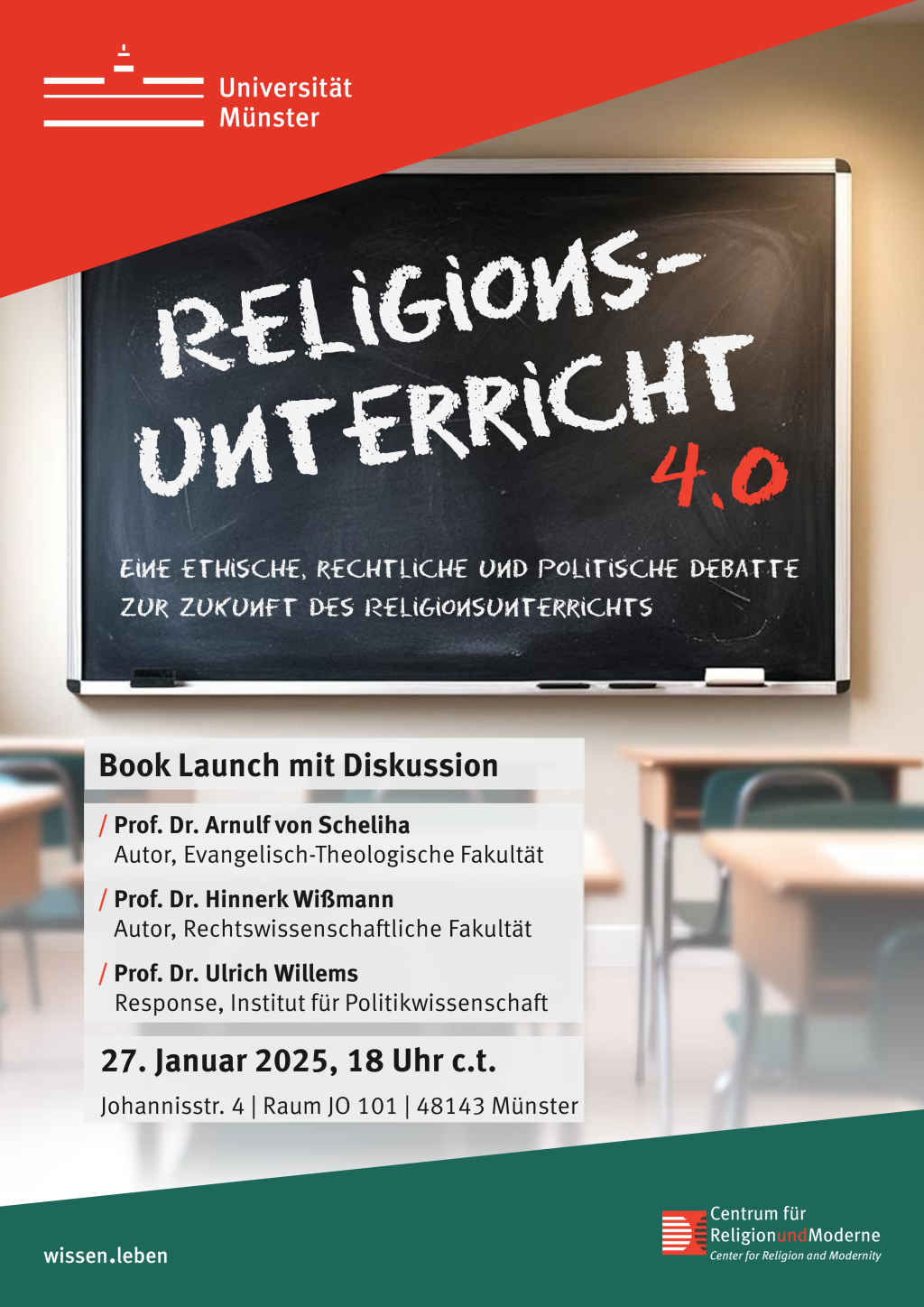 Das Centrum für Religion und Moderne lädt herzlich zum Book Launch der neuen Publikation von Prof. Dr. Arnulf von Scheliha und Prof. Dr. Hinnerk Wißmann „Religionsunterricht 4.0“ am 27. Januar 2025, 18 Uhr c.t., Johannisstr. 4, ein.