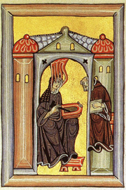 Hildegard von Bingen empfängt eine göttliche Inspiration; ihr Mitarbeiter Probst Volmar schreibt die Vision in den Codex. (Miniatur aus dem Rupertsberger Codex des Liber Scivias. Facsimile).
