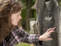 Anna-Maria Balbach untersucht auf dem Friedhof Grabinschriften