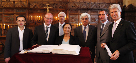 Die "Friedensgäste" tragen sich ins Goldene Buch der Stadt Münster im Friedenssaal ein. (Foto: MünsterView)