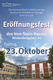 Die Germanisten der WWU Münster laden zum Einweihungsfest ins Vom-Stein-Haus am Hindenburgplatz 34 ein. Am Freitag, dem 23. Oktober, ab 15 Uhr präsentieren Institutsmitglieder ihre Forschungsprojekte und Arbeitsgebiete. Wissenschaftler des Exzellenzclusters „Religion und Politik“ sind dabei, nämlich die Arbeitsgruppe Autorschaft, das Cluster-Projekt C19, „Konfessionalisierung der Sprache“, und der Literaturwissenschaftler Dr. Christian Schmitt.