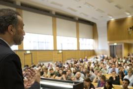 Zu den Vorlesungen des Exzellenzclusters „Religion und Politik“ kommen zahlreiche Studierende der Universität Münster.