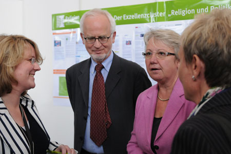 Bundesforschungsministerin Annette Schavan (CDU) hat beim 2. Ökumenischen Kirchentag in München den Informationsstand des Exzellenzclusters „Religion und Politik“ der Universität Münster besucht und die Arbeit des Forschungsverbundes gewürdigt. „Dieser Münsteraner Exzellenzcluster hat mich schon bei der Einrichtung beeindruckt“, sagte die Ministerin. „Der Blick auf die Themenvielfalt und was bislang erreicht wurde, zeigt die Kraft der Geisteswissenschaften und ihrer Rolle in der Universität – gegen alle Unkenrufe.“ Auch werde in dem Cluster deutlich, „wie erfolgreich hier Wissenschaftskommunikation betrieben wird. Das steht den Geisteswissenschaften gut an. Worüber nicht gesprochen wird, das verliert über kurz oder lang an Relevanz.“