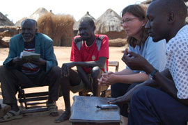 Die Ethnologin bespricht mit einer Gesprächspartnerin der Acholi die Kamerabedienung.