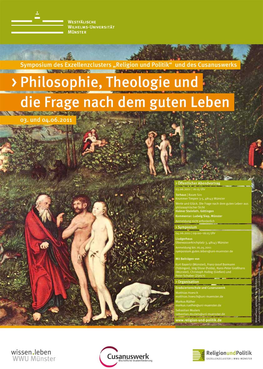 Das Symposium mit dem Titel „Philosophie, Theologie und die Frage nach dem guten Leben“ ist eine gemeinsame Veranstaltung des Exzellenzclusters „Religion und Politik“ und der Bischöflichen Studienförderung Cusanuswerk und wird von Matthias Hoesch, der an der Graduiertenschule des Clusters promoviert, sowie von Markus Rüther und Sebastian Muders organisiert. (bhe)