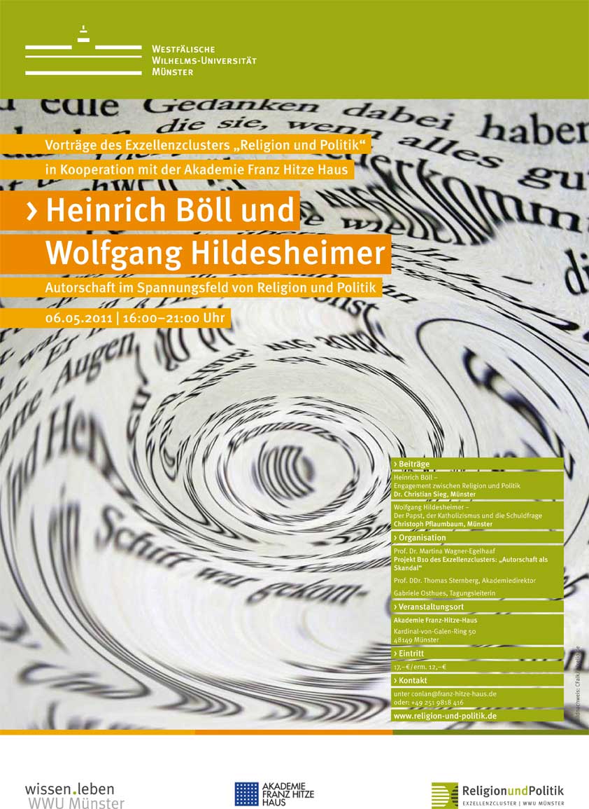 Mit dem Zusammenhang von Literatur, Religion und Politik befasst sich eine neue Veranstaltungsreihe des Exzellenzclusters „Religion und Politik“ der Uni Münster und der Akademie Franz-Hitze-Haus. Sie startet Anfang Mai mit einem Workshop zu den Nachkriegsautoren Heinrich Böll und Wolfgang Hildesheimer. Böll, einer der wichtigsten Autoren der Bonner Republik, steht im Mittelpunkt eines Vortrags von Literaturwissenschaftler Dr. Christian Sieg vom Exzellenzcluster. Wieso der Autor noch heute als „Gewissen der Nation“ wahrgenommen wird, beleuchtet Sieg im Vortrag „Heinrich Böll. Engagement zwischen Religion und Politik“. Das Zusammenspiel von politischen und religiösen Aspekten in Bölls Prosa und die Kirchenkritik waren laut dem Forscher für die Inszenierung von Bölls Autorschaft entscheidend.