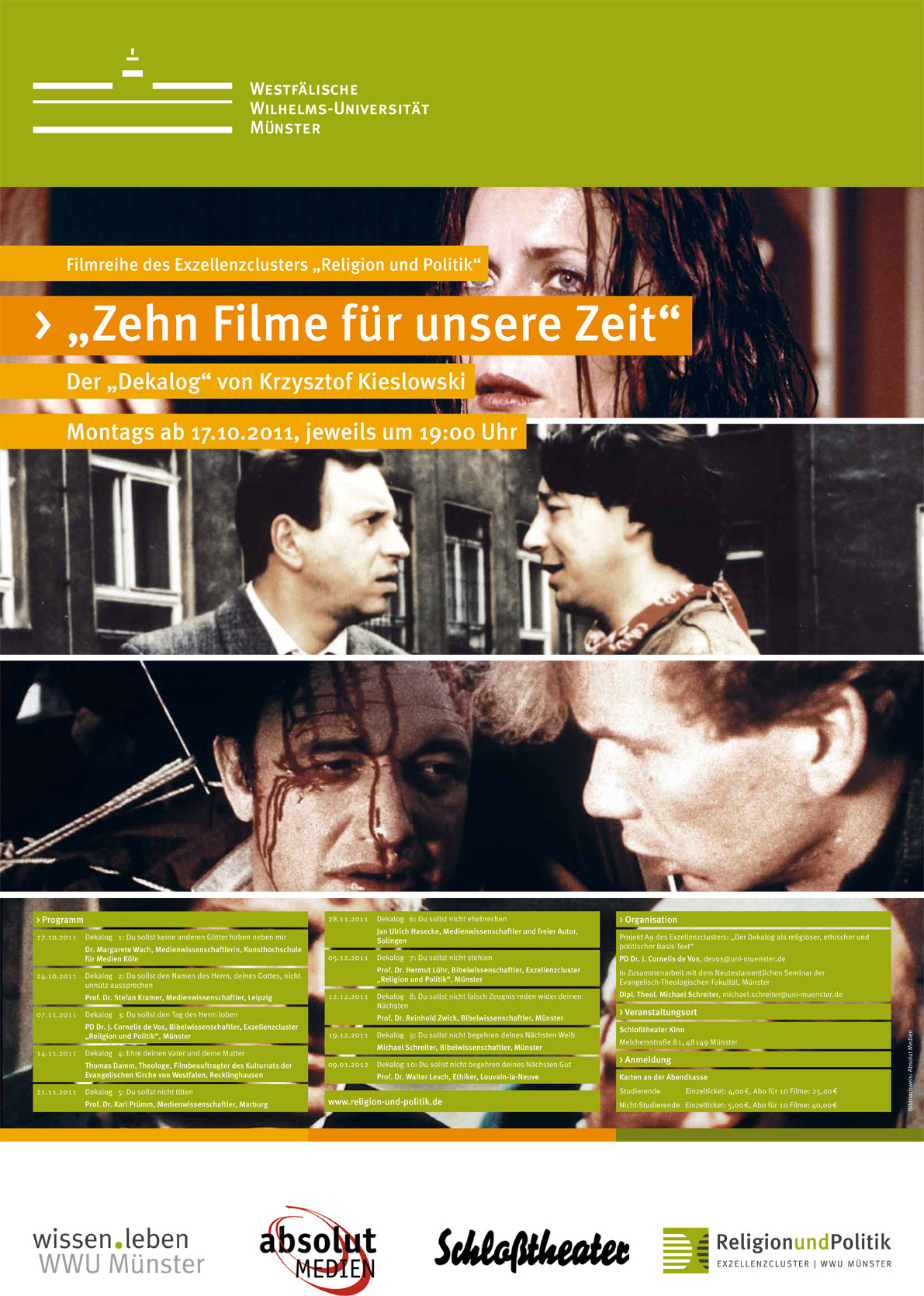 Der Wissenschaftler organisiert die Reihe gemeinsam mit dem Theologen Michael Schreiter vom Neutestamentlichen Seminar der Evangelisch-Theologischen Fakultät der WWU. Unter dem Titel „Zehn Filme für unsere Zeit“ ist der „Dekalog“ an zehn Montagabenden vom 17. Oktober 2011 bis 9. Januar 2012, jeweils um 19.00 Uhr, im Münsteraner Schloßtheater Kino, Melchersstraße 81, zu sehen.