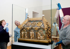 Die Aufbauarbeiten für die „Goldene Pracht“ laufen an beiden Ausstellungsorten auf Hochtouren: Täglich treffen Kuriere mit hochwertigen internationalen und nationalen Leihgaben ein. Die filigranen Werke aus Gold, Silber und Edelsteinen müssen mit äußerster Vorsicht transportiert und ausgepackt werden, wie LWL-Kuratorin Dr. Petra Marx, Mittelalter-Expertin des LWL-Landesmuseums, erläutert. Der Schrein aus Tournai sei von besonderer kunsthistorischer Bedeutung: „Er stammt aus der berühmten Werkstatt von Nikolaus von Verdun, der auch wesentliche Teile des Dreikönigsschreins im Kölner Dom gefertigt hat. Es handelt sich um eines der wenigen Stücke mit einer Inschrift, die auf den Meister Nikolaus von Verdun verweist.“