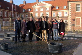 Direktor des LWL-Landesmuseum, Dr. Hermann Arnhold, und Direktor der Domkammer, Dr. Udo Grote (4. und 3. v.l.) mit den Architekten Marc Günnewig und Jan Kampshoff sowie Studierenden der „münster school of architecture“ (msa) auf der Baustelle des goldenen Pavillons zur Ausstellung „Goldene Pracht“