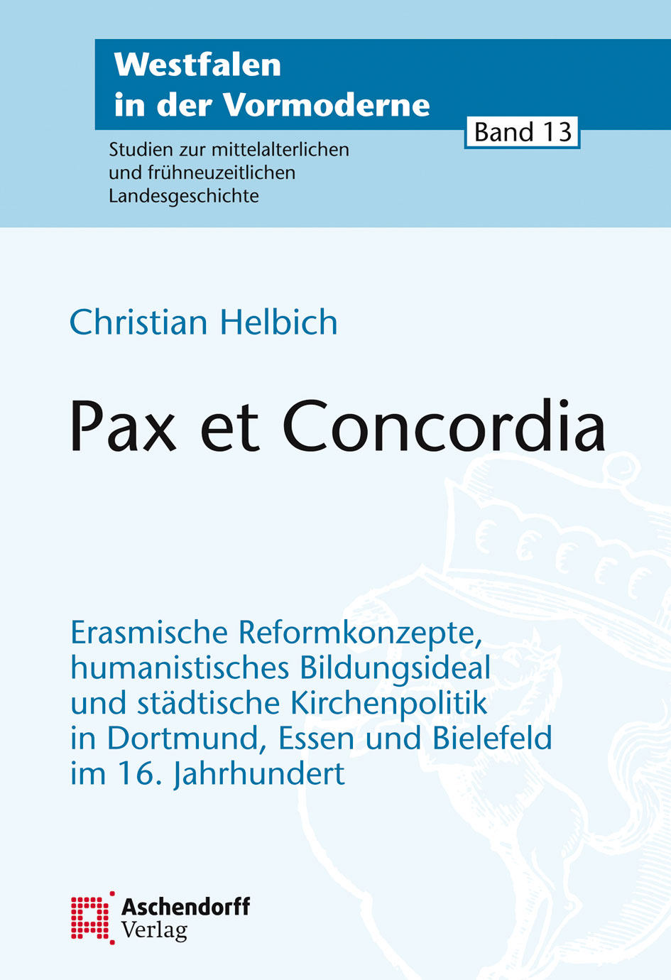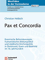 Mit der westfälischen Kirchenpolitik des 16. Jahrhunderts befasst sich das Buch „Pax et Concordia: Erasmische Reformkonzepte, humanistisches Bildungsideal und städtische Kirchenpolitik in Dortmund, Essen und Bielefeld im 16. Jahrhundert“ von Historiker Dr. Christian Helbich. Es ist mit Unterstützung des Exzellenzclusters in der Reihe „Westfalen in der Vormoderne“ im Münsterischen Aschendorff-Verlag erschienen. Der Autor untersucht in der Studie, inwieweit Verantwortliche in den Städten Dortmund, Essen und Bielefeld humanistische Reformimpulse und die landesherrliche Kirchenpolitik der Herzöge von Jülich-Kleve-Berg aufgenommen haben.