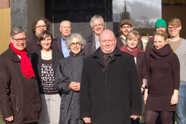 Dr. Hermann Arnhold (Direktor des LWL-Landesmuseums, links), Dr. Udo Grote (Direktor der Domkammer, 3. v. r.), Prof. Dr. Gerd Althoff (Exzellenzcluster "Religion und Politik", Mitte hinten) und Prof. Julia Bolles Wilson (münster school of architecture, 3. v. l.) bei der Eröffnung des goldenen Pavillons auf dem Domplatz.