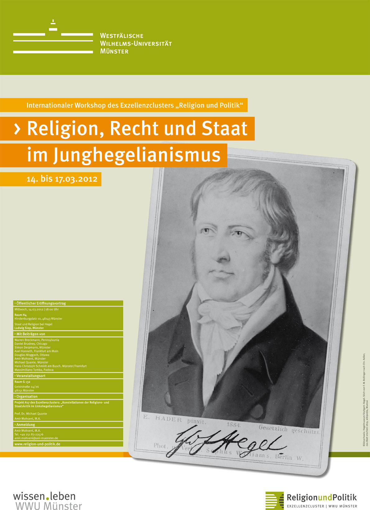 Die einflussreiche Gruppe der sogenannten Junghegelianer steht im Mittelpunkt eines internationalen Workshops am Exzellenzcluster „Religion und Politik“. Den Auftakt zu der Tagung „Religion, Recht und Staat im Junghegelianismus“ bildet ein öffentlicher Vortrag von Philosoph Prof. Dr. Ludwig Siep. Der Vortrag zum Thema „Staat und Religion bei Hegel“ beginnt am Mittwoch, dem 14. März, um 18.00 Uhr im Hörsaal H4 am Hindenburgplatz 10.