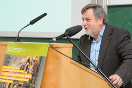 Der Vortrag trug den Titel „Die christlich-abendländische Wahrnehmung anderer Religionen im frühen und hohen Mittelalter: methodische und vergleichende Aspekte“. Der Historiker stellte darin Ergebnisse seines Forschungsprojektes „The Perception of Other Religions in the Christian Occident during the Early and Central Middle Ages (5th – 12th centuries)“ vor, das der „European Research Council“ (ERC) von 2009 bis 2012 förderte. Zuvor sei das christliche Heidenbild nur beiläufig und die Wahrnehmung von Häretikern und Griechisch-Orthodoxen noch nicht umfassend analysiert worden, so der Forscher. Das Juden- und Sarazenen-Bild wurde nach seinen Worten meist im Zusammenhang mit dem Antijudaismus oder dem mozarabischen Islambild untersucht. Die vergleichende Betrachtung der Wahrnehmung aller Religionen hat demnach das ERC-Projekt von Prof. Goetz erstmals in Angriff genommen.