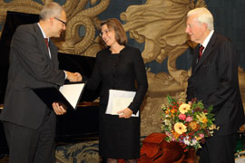 Mit ihrem Buch „Des Kaisers alte Kleider. Verfassungsgeschichte und Symbolsprache des Alten Reiches“ habe Barbara Stollberg-Rilinger ein herausragendes Werk verfasst, begründete das Kolleg seine Entscheidung. Sie habe wissenschaftliches Neuland erschlossen, das über die Fachgrenzen hinaus wirke und in seiner sprachlichen Gestaltung vorbildhaft sei. Laudator Prof. Dr. Gerrit Walther, Historiker an der Bergischen Universität Wuppertal, ging in seiner Rede auf Barbara Stollberg-Rilingers Schaffen ein. Ein wichtiger, charakteristischer Zug in „Des Kaisers alte Kleider“ und anderen Werken der Historikerin sei, dass konkrete, lebendige Menschen handelten. „Barbara Stollberg-Rilinger ist eine vorzügliche Historikerin, weil sie Menschen ernst nimmt“, betonte er. Zugleich habe sie es geschafft, historische Ereignisse in „eleganter, anschaulicher Klarheit und ohne Jargon und Wichtigtuerei" zu schildern, würdigte er die Preisträgerin als „bedeutende Forscherpersönlichkeit“. Den Preis übergaben der Vorsitzende des Kuratoriums des Historischen Kolleg, Prof Dr. Andreas Wirsching, und der Vorsitzende der Alfred und Cläre Pott-Stiftung, Dr. Klaus Liesen.