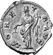 Figur der Moneta, der Personifikation des Geldes, auf einer Silbermünze des Kaisers Antoninus Pius