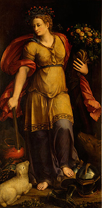 Für die meisten allegorischen Darstellungen des Friedens liefern antike Mythen oder die Bibel die Bildvorlage: Spätere Epochen verstärkten ihre Aussage, indem verschiedene Allegorien verkettet wurden, im Mittelalter und in der Frühneuzeit häufig Frieden und Gerechtigkeit – Pax und Justitia. „Der italienische Maler Battista Dossi schuf im 16. Jahrhundert für den Herzog von Ferrara fast lebensgroße Porträts von Pax und Justitia. Die Figur des Friedens hält in einer Hand eine Fackel zum Verbrennen von Waffen, ihre andere Hand umfasst ein Füllhorn mit Früchten, blühenden Zweigen und Getreideähren (Abb. 2). „In dieser Zeit galt Pax ohne Justitia als ungerechter Frieden, lediglich als momentane Waffenruhe“, so Prof. Krems. Insofern zeigen die Gemälde die komplementären Leitbilder der damaligen Staats- und Regierungskunst.