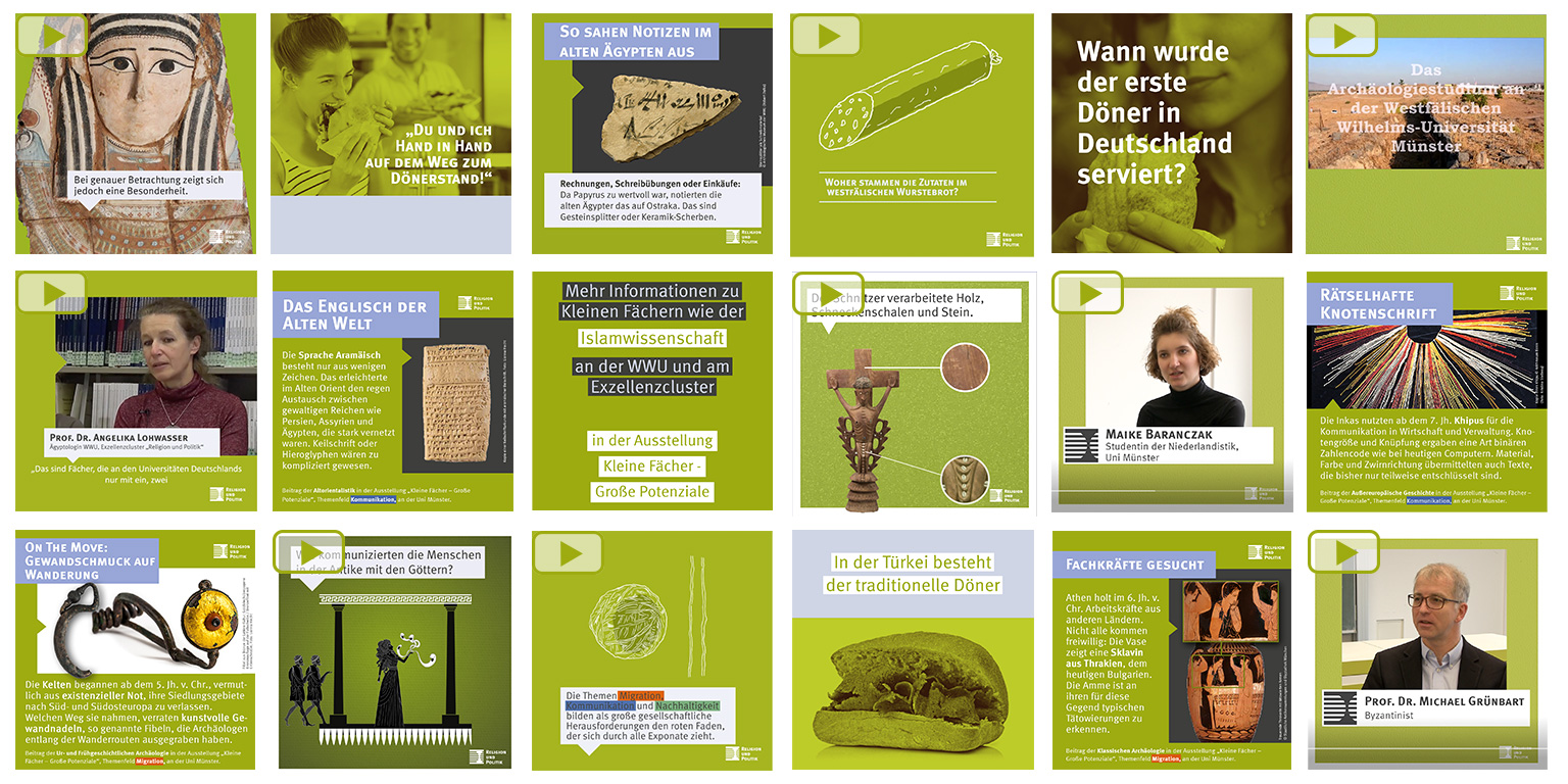 Die Ausstellung zeigt, wie viel historisch-kulturwissenschaftliches Wissen die Kleinen Fächer der Geisteswissenschaften zum Verständnis heutiger Gesellschaften und ihrer globalen Herausforderungen beizutragen haben. Sie war zunächst im Frühjahr 2020 im Archäologischen Museum der WWU zu sehen sowie in einer Social-Media-Reihe des Zentrums für Wissenschaftskommunikation des Exzellenzclusters. Unter www.religion-und-politik.de/kleinefaecher ist sie zur digitalen Dauerausstellung geworden. Sie präsentiert auch kleine Trailer und Testimonials, in denen Professorinnen und Professoren sowie Studierende einen lebendigen Einblick in ihr Leben und Arbeiten, Forschen und Studieren Kleiner Fächer geben. Unterstützer der Ausstellung waren die Hochschulrektorenkonferenz (HRK), das Rektorat der WWU sowie die Fachbereiche 8 und 9 der WWU. Kooperationspartner ist der Exzellenzcluster „Religion und Politik“, an dem die Kleinen Fächer eine große Rolle spielen, mit dem Zentrum für Wissenschaftskommunikation.