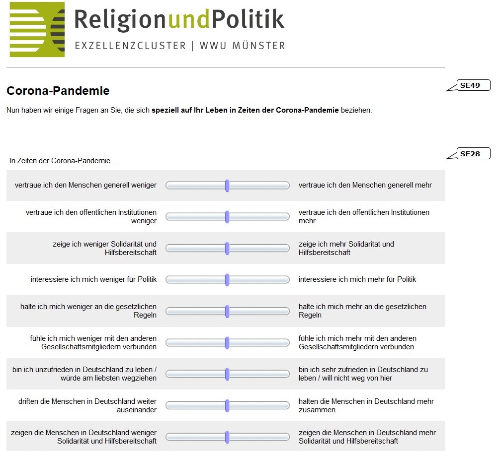 Die Corona-Krise betrifft das zentrale religiöse Bezugsproblem: die Kontingenzbewältigung. Kontingenz ist alles, was möglich, aber nicht notwendig ist – Fragen nach dem Warum und Wozu, die sich besonders in Krisenzeiten wie der aktuellen Pandemie stellen. Welche Rolle spielt aktuell die Religiosität bzw. Spiritualität der Einzelnen in Ihrem persönlichen Umgang mit der Corona-Krise? Das erfragen wir in unserer Studie, die wir in Kooperation mit einer internationalen Forschungsgruppe (mit Wissenschaftler/innen aus Italien, Spanien und Finnland) sowie dem “Forschungsinstitut Gesellschaftlicher Zusammenhalt” an der Universität Leipzig durchführen. Neben den religiösen Einstellungen und Verhaltensweisen werden noch wesentliche soziale und politische Dimensionen abgefragt, welche den gesellschaftlichen Zusammenhalt ausmachen (z. B. Vertrauen, Identifikation, Verantwortungsbereitschaft, Partizipation). Das Schlagwort „Zusammenhalt“ hat Hochkonjunktur – in Medien, Politik und Gesellschaft. Doch wie ist es tatsächlich um unseren Zusammenhalt derzeit bestellt? Rücken wir näher zusammen oder driften wir weiter auseinander? Und welche Rolle spielt dabei die individuelle Religiosität – eint sie uns oder spaltet sie uns? Diese Fragen erstreben wir mit unserer Studie zu beantworten.