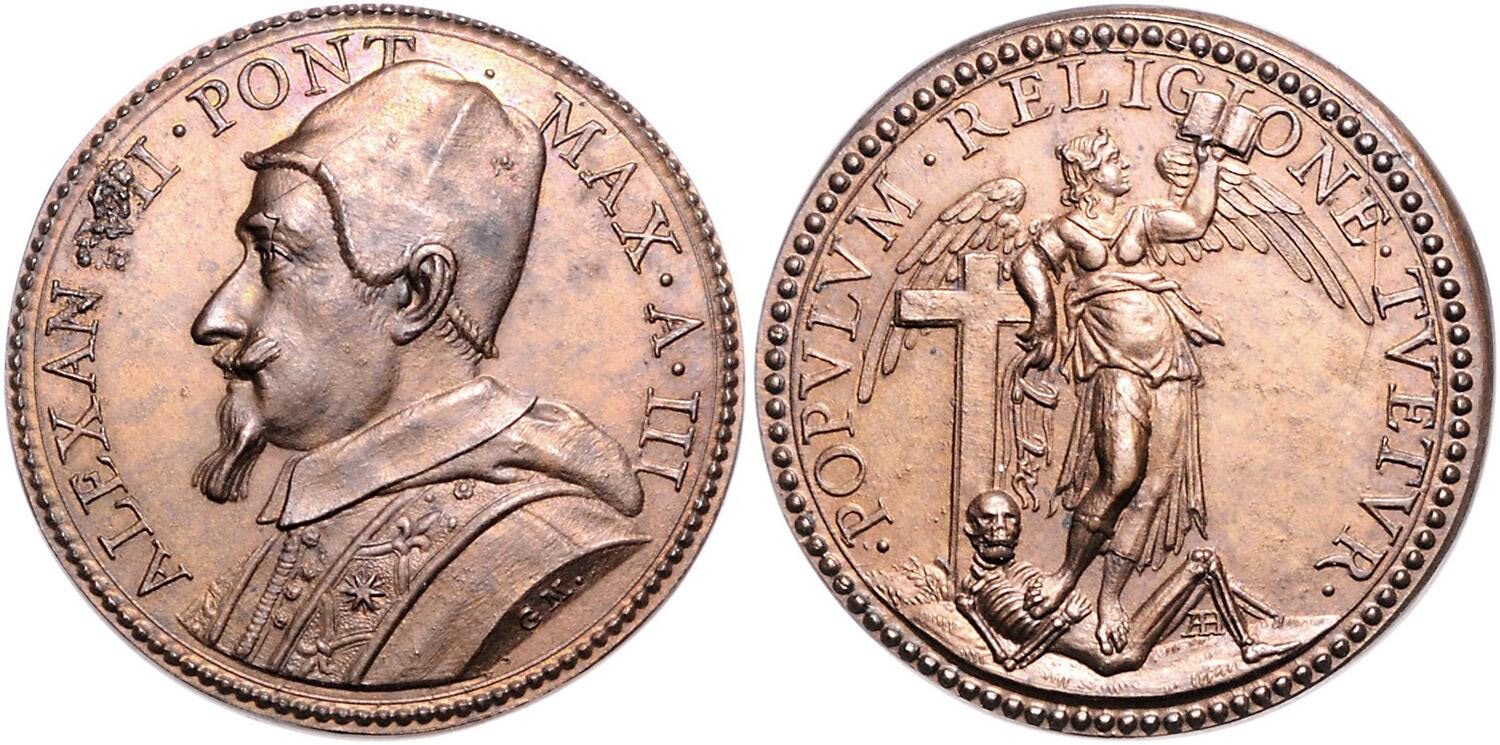 The most important medal issued by the Holy See was the medaglia annuale, the medal distributed every year on Peter and Paul’s Day (29 June). Thus, the annual medal of 1657 (Fig. 1) had as its theme the victory over the plague – although the plague itself was not declared over until two months later, in August 1657. It was struck by the Holy See’s own medallist, Gaspare Morone Mola. Because it was to be a highly official commemorative piece, great consideration was given in advance to its theme and design, with the famous artist Gian Lorenzo Bernini providing the template (for the reverse side). On the obverse, we see Pope Alexander VII in a bust portrait in adorned regalia and turned to the right.