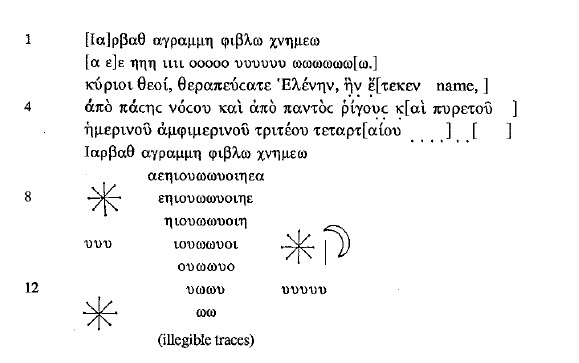 We do not know the name of the woman, but we do know that she called on Jesus for divine help, and that she asked for protection from fever, sickness, witchcraft and evil spirits; the text concludes with the Trisagion, praise of the Trinity. The combination of popular Christian piety and magical practices is revealed not only in the reference to the New Testament tradition of the story of suffering and the miracles of Christ, and the appeal to Jesus as a healing deity, but also in the fact that, like the magical formulae of the first example, the Trinitarian formula is deemed to ensure the amulet’s efficacy.