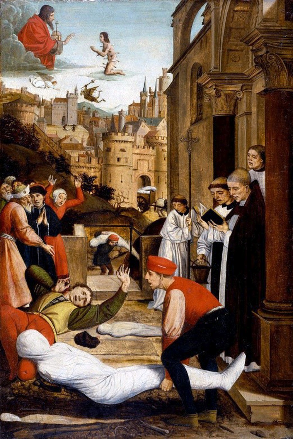 The ‘earthly’ narrative strand culminates at the very bottom of the painting in the depiction of the barely recognizable and only half-buried corpse; the tools of the grave helpers are still hastily scattered on the ground: Lieferinxe’s pictorial depiction also culminates in the narrative of the observance of Christian burial commandments, which in view of the countless plague victims can no longer be performed. In the upper third of the painting, on the other hand, a different story unfolds: while a (plague) demon fights with an angel, St. Sebastian, who can be recognized beyond doubt by the arrows, kneels before God and intercedes for the city threatened by the plague, which threatens to destroy the city’s order in the flood of corpses.