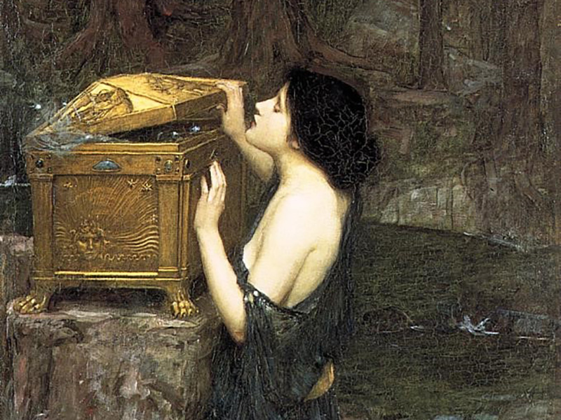 John William Waterhouse’s ‘Pandora’ depicts a key moment in Greek mythology: still angry at Prometheus’ sacrilegious robbery of fire, Zeus, full of cunning, contemplated revenge: the father of the gods left a vessel full of evil to human beings, together with the treacherous commandment to keep it locked. The plan worked: Pandora’s curiosity was greater than Zeus’ warning. Immediately after her marriage to Prometheus’ brother, Epimetheus, Pandora opens the box, releasing misfortune, misery, suffering, and illness into the world. Hesiod tells of the ‘fall’ in the Greek myth thus: