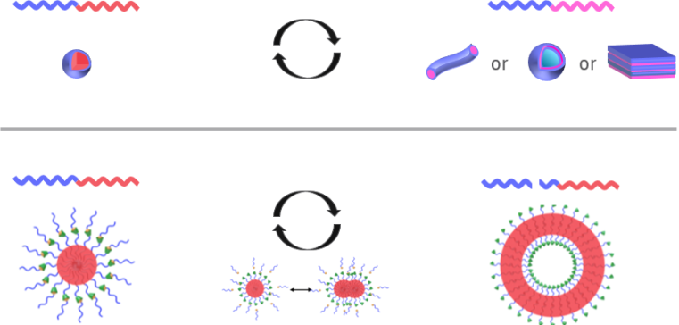 In our contribution to CRC 1459, we will develop dissipative block copolymer nanostructures and explore their application as sensors, actuators, and memory in synthetic adaptive and intelligent systems. Block copolymers consist of two or more covalently linked incompatible segments capable of self-assembling into complex nanostructures, such as micelles, vesicles & cubosomes. Driven by differences in chemical affinity, like solubility, the resulting nanostructure is primarily defined by the lengths of the various blocks. We are designing block copolymers that can actively alter their composition through energy-driven block fragmentation. By incorporating and tuning orthogonal and multivalent fragmentation mechanisms the stability, lifetime and self-assembly behavior of the block copolymer aqueous solution can be adjusted. The resulting out-of-equilibrium nanostructures can only exist under a sufficient energy supply. These nanostructures will be stabilized into dynamic steady states by regulating the energy supply through the implementation of intrinsic feedback mechanisms.