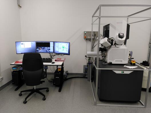 Aquilos 2+ • Dual beam FIB-REM (Fokussierter Ionenstrahl Rasterelektronenmikroskop) • Ausgestattet mit Kryostage und Fluoreszenzmikroskop • Präparation dünner (Kryo-)Lamellen aus dicken Proben • 3D-Rekonstruktion dicker Proben (Slice and View)
