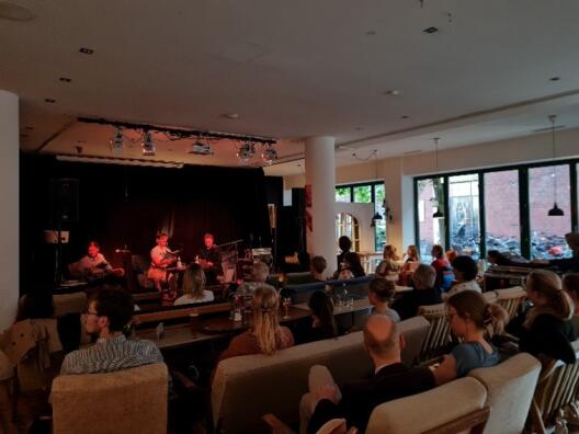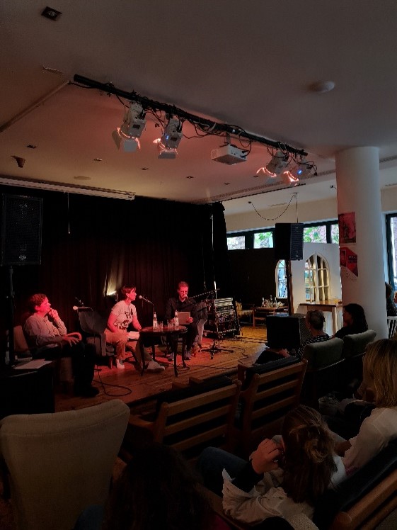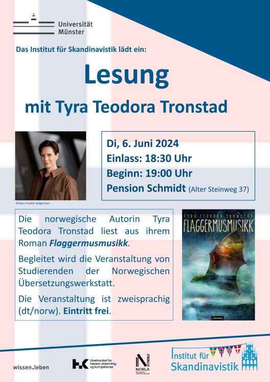Wie schon im Jahr zuvor hatten sich auch diesmal Studierende unseres Instituts zusammen mit dem Norwegisch-Lektor Magnus Enxing im Vorfeld mit Flaggermusmusikk auseinandergesetzt und Passagen des Romans aus dem Norwegischen übersetzt. Durch den Wechsel von norwegischer Lesung der Autorin und deutscher Übersetzung durch Studierende eignete sich die Veranstaltung auch für Besucher*innen ohne oder mit geringen Norwegisch-Kenntnissen.