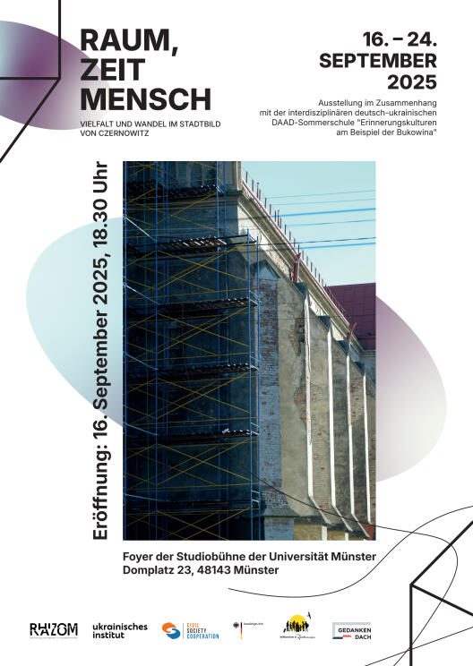 Die Bukowina ist eine historische Region, die sich durch ein plurikulturelles und -religiöses Leben auszeichnete, das teils von friedlichem Miteinander, teils aber auch von Konfrontation, die bis zu extremer Gewalt reichte, geprägt war. Die als Teil der Oblast Černivci zur Ukraine gehörende Nordbukowina ist bis heute eine heterogene Region mit mehreren Minderheiten. Eine vom Deutschen Akademischen Austauschdienst (DAAD) geförderte Sommerschule der Universitäten Münster und Černivci widmete sich vom 7.-16.9.2025 aus der Perspektive verschiedener geistes- und sozialwissenschaftlicher Disziplinen Umgangsweisen in Geschichte und Gegenwart mit der Erinnerung an diese Formen der Koexistenz. Berücksichtigt wurden dabei auch aktuelle Entwicklungen, Reaktionen auf und Folgen des russischen Angriffskrieges, wie sie sich in Černivci etwa im Stadtbild, in der Entfernung und Neuerrichtung von Denkmälern, und in der durch die Aufnahme vieler Binnenflüchtlinge veränderten Bevölkerungsstruktur zeigen. Die anlässlich der Abschussveranstaltung der Sommerschule eröffnete Wanderausstellung „Raum, Zeit, Mensch. Vielfalt und Wandel im Stadtbild von Czernowitz“ dokumentiert diesen Wandel. Die Ausstellung, die in Zusammenarbeit der NGO „Ukrainisch-Deutsche Kulturgesellschaft Tscherniwzi“ am Zentrum Gedankendach und des Vereins „Begegnung in Falkensee e.V.“ mit Unterstützung durch das RAZOM/RHIZOM-Programm im Rahmen der vom Auswärtigen Amt organisierten Initiative „Zusammenarbeit mit der Zivilgesellschaft“ entstand, ist noch bis zum 24. September (Mittwoch) im Foyer der Studiobühne zu sehen.