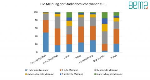 An einem Fußballspiel sind neben den Spielern, den Trainern und dem Schiedsrichter viele weitere Akteure beteiligt. Im Rahmen unserer Stadionbefragung an 17 Standorten der ersten drei deutschen Fußballligen wollten wir wissen, was für eine Meinung es zu unterschiedlichen Akteuren gibt. Die Befragten konnten auf einer Skala von 1 bis 6 antworten, wobei der Wert 1 für eine "sehr gute Meinung" und der Wert 6 für eine "sehr schlechte Meinung" steht. Die Fans mit "Steher-Tickets" genießen den besten Ruf im Stadion, gefolgt von den "Sitzplatz-Fans". Auch Ordner und Vereinsführung sind vergleichsweise gut angesehen. Drei spezielle Gruppen – DFL/DFB, Ultras und auch die Polizei – genießen bei den Zuschauern im Fußballstadion nicht unbedingt den besten Ruf. So hat etwa ein Viertel der Befragten keine gute Meinung von den Einsatzkräften der Polizei. Insbesondere jedoch hat der durchschnittliche Stadionzuschauer keine gute Meinung von Ultras und schon gar nicht vom DFB und der DFL.