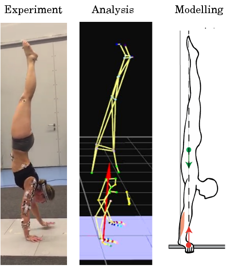 We study how adults - who have finished their growth - learn the postural coordination to perform a non-habitual task, specifically standing and walking on their hands. We combine experiments, analysis and modelling to elucidate the neuromechanical control of handwalking.