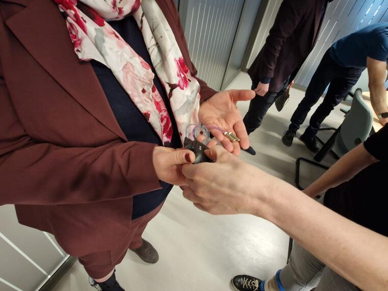 Im Mittelpunkt des Besuchs standen der aktuelle Entwicklungsstand des tragbaren Vibrationssystems sowie die nächsten Schritte innerhalb des Projektkonsortiums. Vorgestellt wurden insbesondere die Arbeiten am zweiten Prototyp, aber auch die vorherige Version war vertreten und wurde von der Ministerin vor Ort direkt ausprobiert.