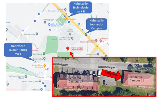 Vom Münsteraner Hauptbahnhof aus nehmen Sie den Ausgang Richtung Innenstadt. Von dort aus gehen Sie ein paar Meter nach rechts zur Bushaltestelle auf Höhe des Euroshops. Nehmen Sie nun Linie R72/R73 in Richtung Altenberge Hauptbahnhof. Steigen Sie am „Leonardo Campus“ aus. Überqueren Sie die Straße und betreten den Campus. Halten Sie sich nun auf dem Weg der nach links und außen an den Gebäuden entlang verläuft. Folgen Sie diesem Weg, bis er eine Biegung nach rechts macht. Kurz nach der Biegung befindet sich das Gebäude auf der linken Seite.