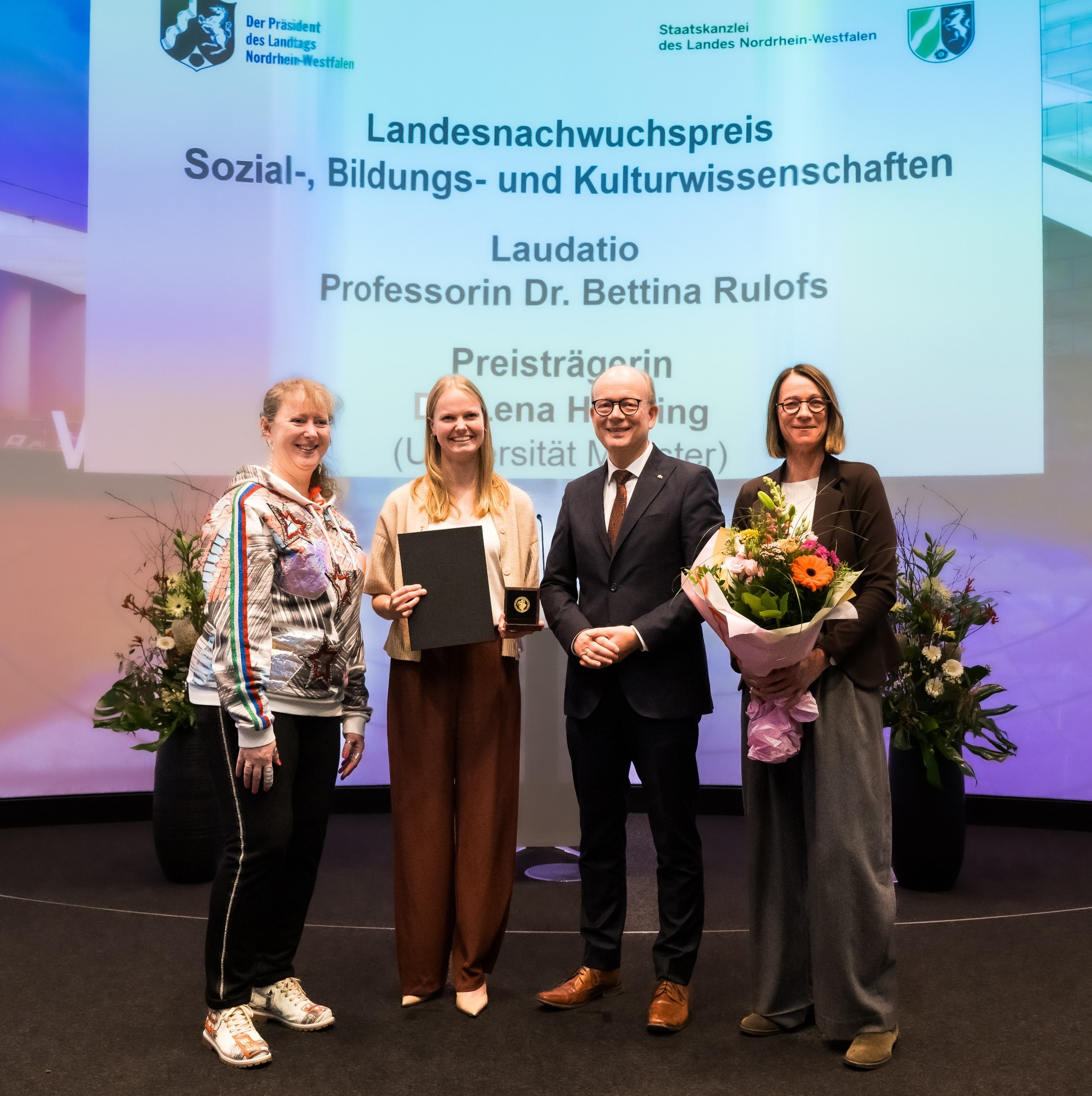 On 22 January 2026, Dr. Lena Henning was awarded the North Rhine-Westphalia Nachwuchspreis for Sport and Exerciese Science 2026 in the category 'Social, Educational and Cultural Sciences' at the State Parliament Forum. The prize, awarded by State Parliament President André Kuper and State Secretary for Sport and Volunteering Andrea Milz and endowed with 5,000 euros, recognises her research into physical activity and health in childhood from a sports and developmental psychology perspective. Professor Johannes Wessels and Professor Maike Tietjens from the Rectorate of the University of Münster, as well as Professors Heiko Wagner, Helga Leineweber and Nils Neuber from the Institute of Sport and Exercise Science, attended the award ceremony; the laudatory speech was given by Professor Dr. Bettina Rulofs from the German Sport University Cologne.
