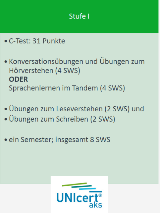 | Abschluss | Studienbegleitende, kumulative Prüfung Das UNIcert® I- Zertifikat entspricht der Stufe B1 des Gemeinsamen Europäischen Referenzrahmens für Sprachen (GER). |
