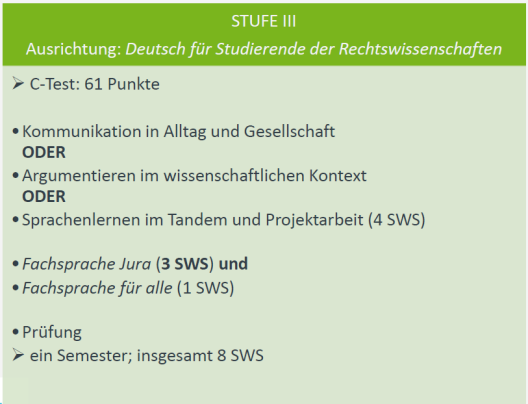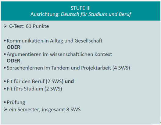| Ziel | Absolvent*innen von UNIcert® III sollen den sprachlichen Anforderungen eines Auslands- und Studienaufenthaltes im Land der Zielsprache in besonderem Maße gewachsen sein. |