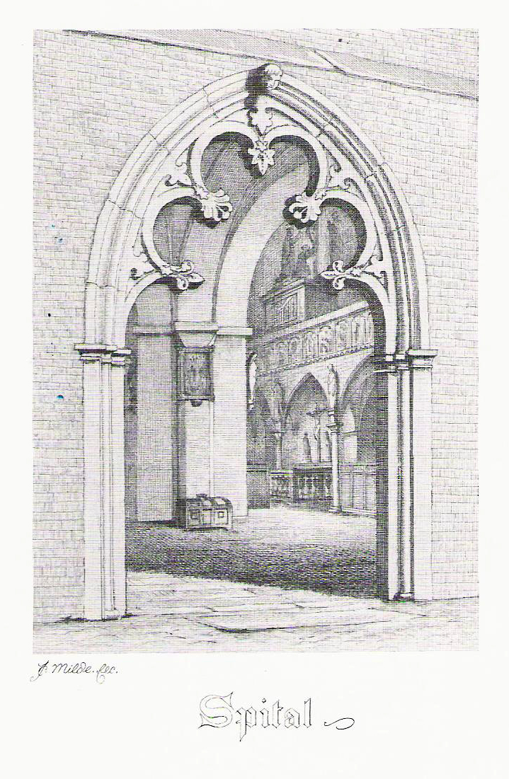 Blick in die Spitalskirche, Heilig-Geist-Hospital in Lübeck, Zeichnung von Carl Julius Milde, 1857 (Quelle: Lübecker ABC, 1857; Wikimedia Commons)