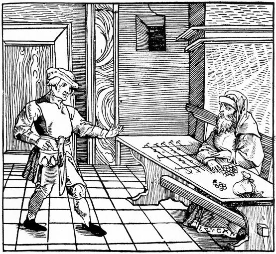 Ein jüdischer Geldverleiher an seinem Rechentisch (Holzschnitt Anf. 16. JH., Erstabdruck vermutl. in dt Ausgabe von Cicero, De officiis, 1533; Bildzitat aus: Sievers, Leo: Juden in Deutschland, Hamburg 1978, S. 90)