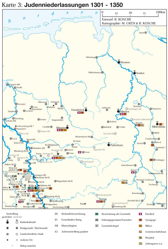 Niederlassungen der Juden 1301–1350 zwischen Rhein und Weser (Entwurf: R. Kosche; s. Rosemarie Kosche: Studien zur Geschichte der Juden zwischen Rhein und Weser im Mittelalter, Hannover 2002, S. 428-429)