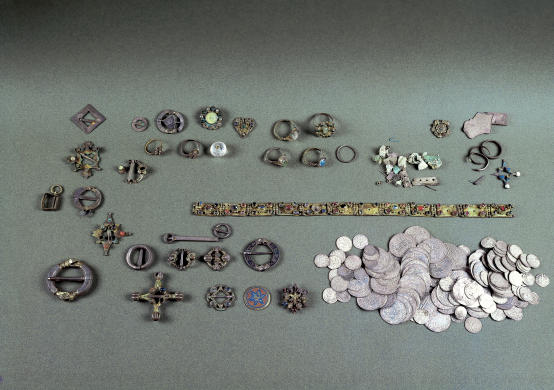 Der im Stadtweinhaus nahe dem ehemaligen Judenviertel aufgefundene Münsterische Münzschatz aus der Mitte des 14. Jhs. war möglicherweise von einem ansässigen Juden in der Verfolgungszeit des Pestjahres 1350 versteckt worden. (Westf. Landesmuseum Münster für Kunst- und Kulturgeschichte)