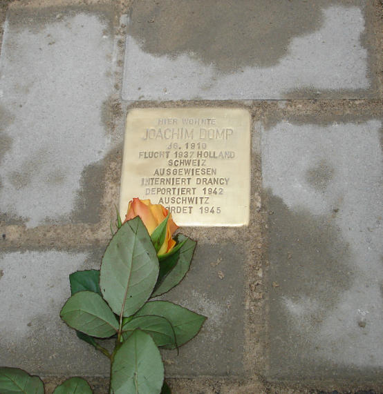 Stolperstein in der Brüderstraße 8 in Münster für den Musikwissenschaftler Dr. Joachim Domp (* 1910 Münster; umgekommen im Januar 1945 im KZ Auschwitz; Foto: R. Schlautmann-Overmeyer, 2010)
