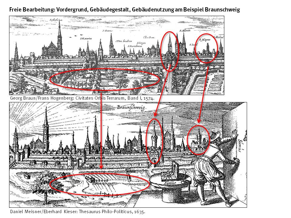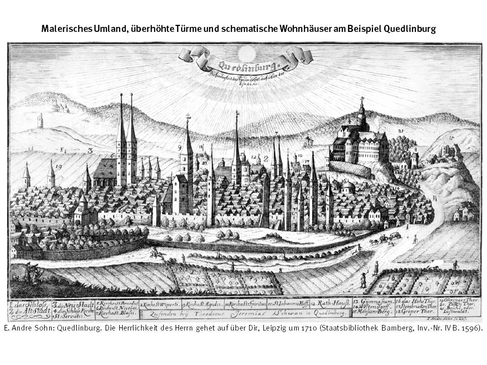 Malerisches Umland, überhöhte Türme und schematische Wohnhäuser am Beispiel Quedlinburg E. Andre Sohn: Quedlinburg. Die Herrlichkeit des Herrn gehet auf über dir, Leipzig um 1710 (Staatsbibliothek Bamberg, Inv.-Nr. IV B. 1596).