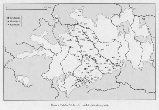Größenkategorien der 1811 erfassten Städte Kursachsens mit einem Grenzwert von 2500 Einwohnern für Klein- und Mittelstädte (aus: Reihe Städteforschung A 54: Stadt und Handwerk in Mittelalter und Früher Neuzeit, hg. v. Kaufhold/Reininghaus, Köln u.a. 2000; Entwurf: K. Keller)